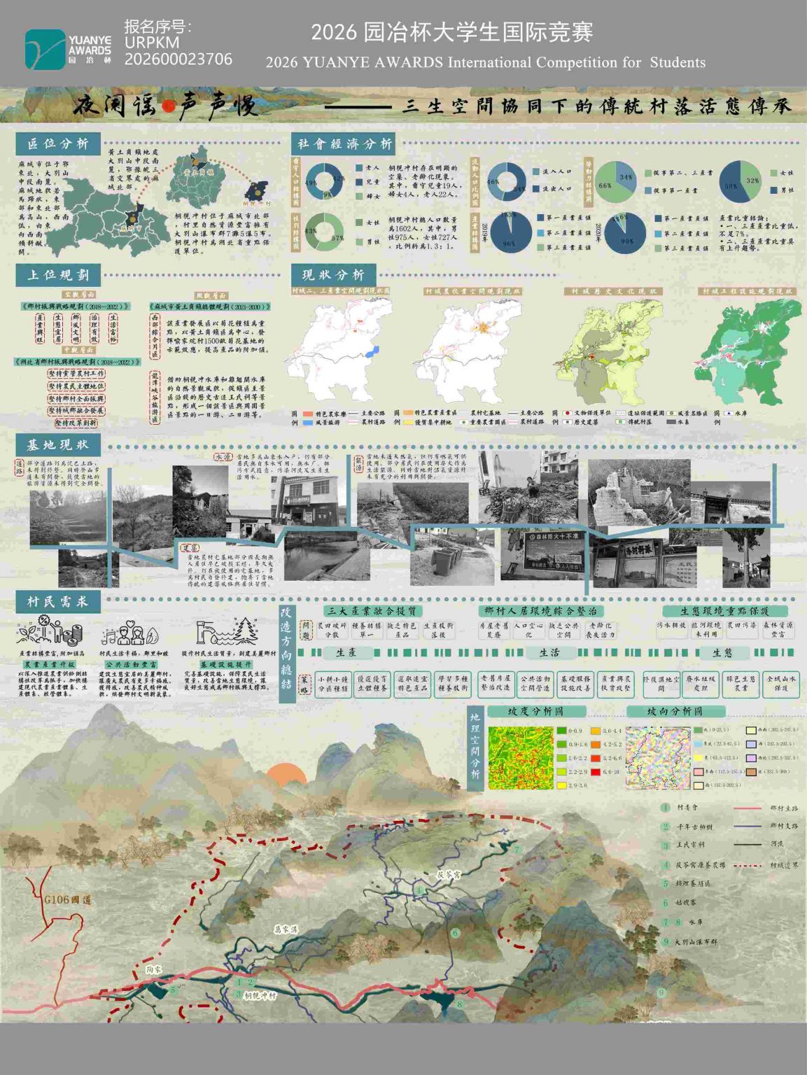 本设计以 “夜阑谣・声声慢 —— 三生空间协同下的传统村落活态传承” 为核心主题,聚焦目标村落文脉流失、功能割裂、生态脆弱等现状问题,以 “生产 - 生活 - 生态” 空间协同为核心路径展开更新设计。 生产维度, ...