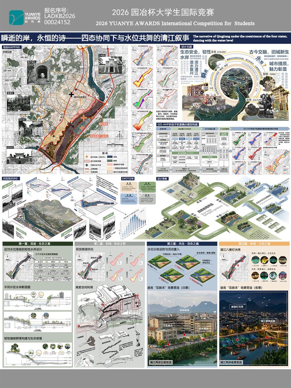 网展图1 作品简介:本项目为恩施清江城区段滨水韧性更新设计,聚焦清江季节性水位涨落的场地痛点,依托GIS水文模拟、AHP多因子耦合模型、AI辅助文生图设计等数字技术,构建生态、形态、活态、文态四态协同的完整 ...