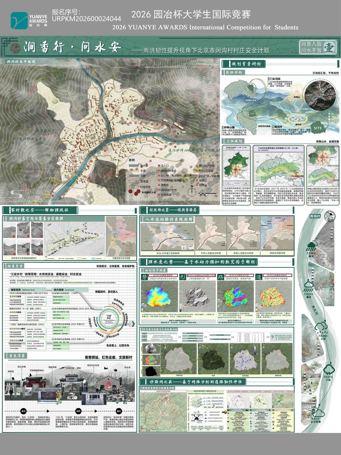 本帖最后由 韩硕 于 2026-3-2 17:08 编辑 本设计 “涧香行・问水安” 以雨洪韧性提升为核心,针对北京市门头沟区涧沟村开展村庄安全规划设计,首先依托实地调研与历史资料梳理,明确该村三河交汇的地形特征、老 ...
