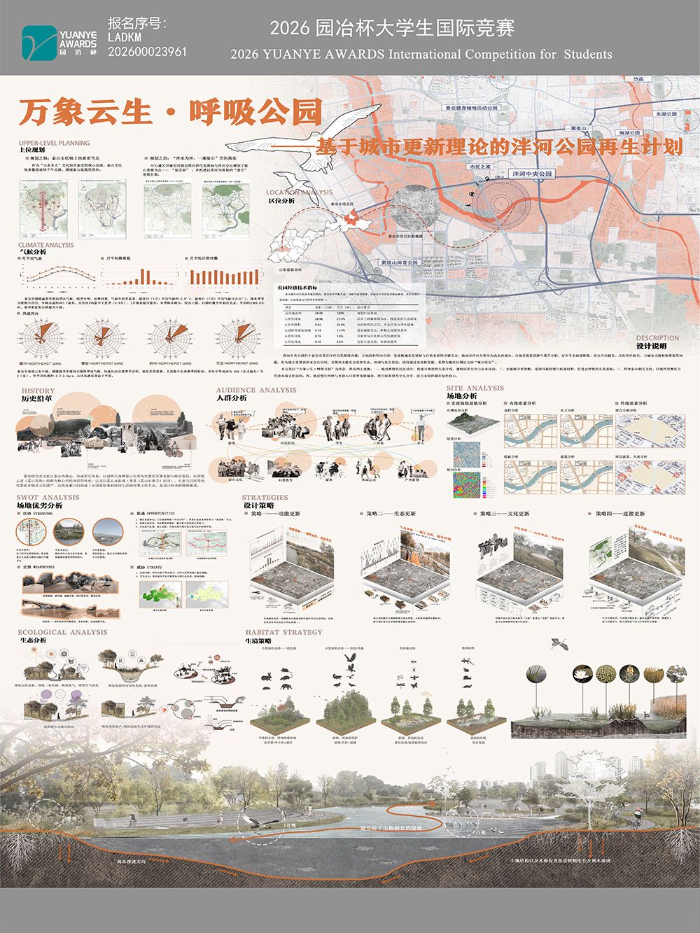 本帖最后由 zcf 于 2026-4-8 16:18 编辑 本设计以“城市更新”为理论基石,针对泰安市泮河中央公园现状问题,提出“万象云生·呼吸公园”的再生理念。设计从功能、生态、文化、连接四大维度展开:通过弹性水岸 ...