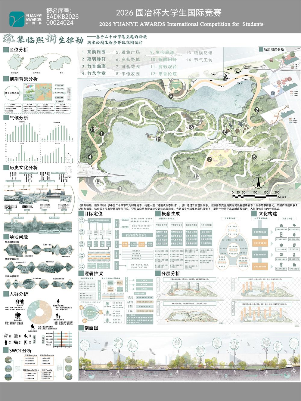 本帖最后由 陈筱彦 于 2026-3-7 20:05 编辑 本作品为浙江农林大学风景园林规划设计课程作业。设计以二十四节气为线索,重构临安滨水公园生态空间,融合茶韵雅园、物候纪馆等14个特色节点。通过分层分析与人群研 ...
