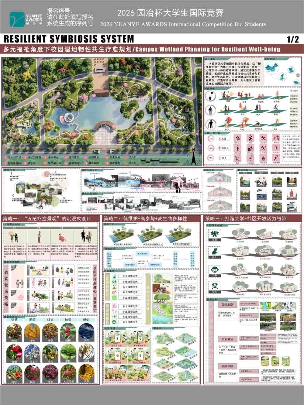 本设计以大学校园小西湖为场地基底,以 “韧性共生体” 为核心设计主线,构建生态 — 社会 — 心理三位一体的疗愈性景观网络。通过低干预式生态修复营造、五感疗愈空间精细化塑造,以及校社共享的多元参与机制,同步 ...