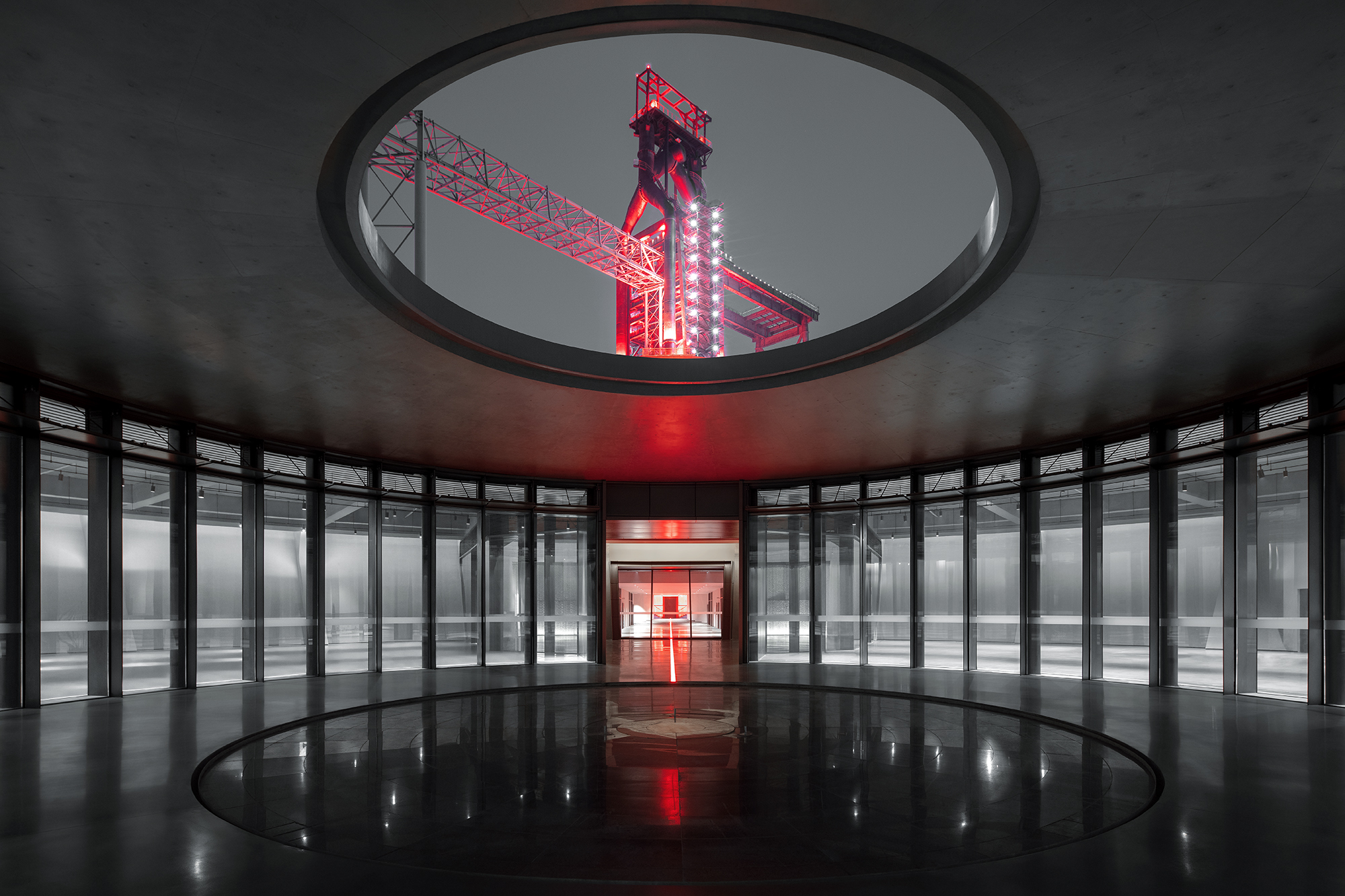 圆型天井位于展厅空间正中,天井下方是和地面齐平的水池,远处的高炉天际线形成工业奇观场景。 摄影:夏至 Canopyof the atrium frames the Blast Furnace, reflected in the pool. Photographed by Xiazhi