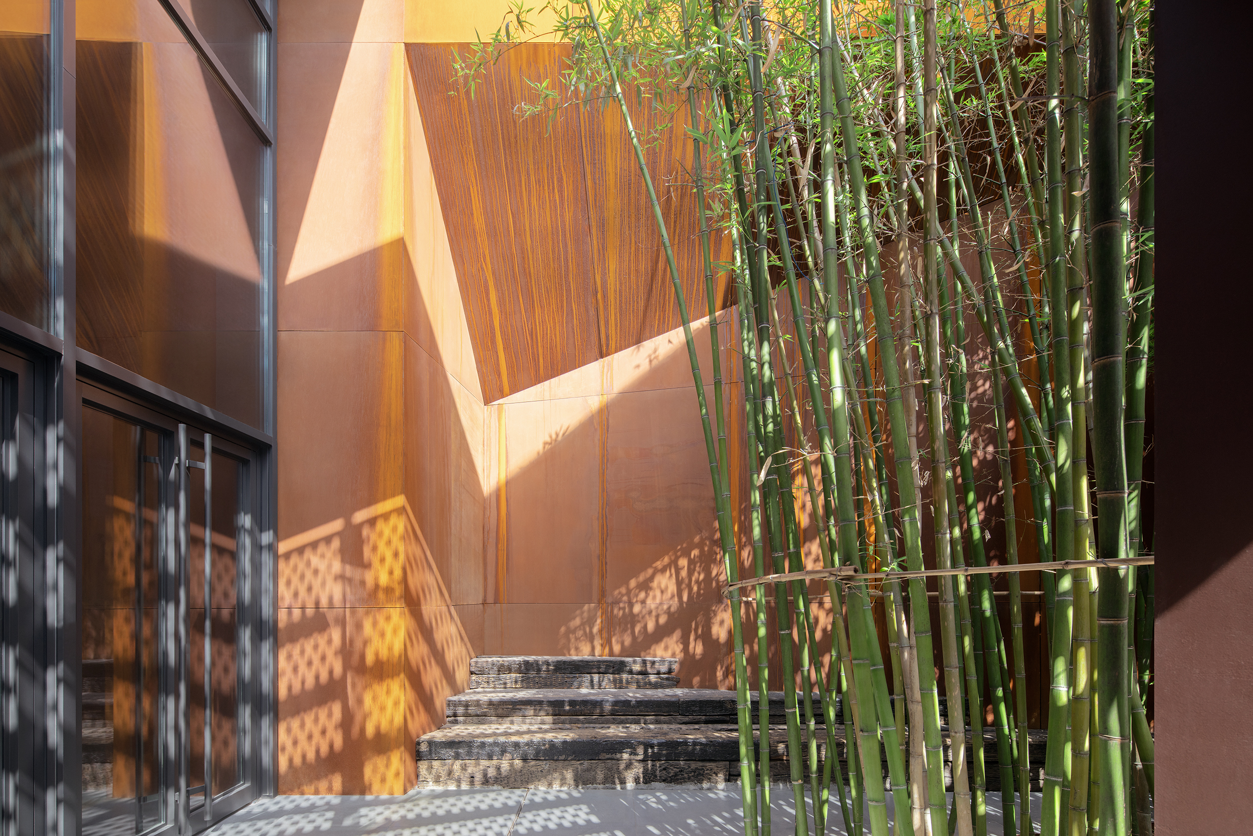 D馆小庭院,旧枕木及耐候钢板与自然环境的融合。 摄影:夏至 Viewto the courtyard, Exhibition Hall D. Photographed by Xiazhi