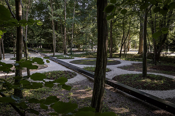 三位设计师想在由灌木丛围绕的内部空间处,在战后遗存的战壕痕迹以及菌丝网状结构之间,建立一种具有象征意义的人造平行装置。而沿着它所塑造出的图案,贯穿花园的路径蜿蜒而行,穿过繁茂的树丛,勾勒出一隅圆形种植空间——在这里,人们可以欣赏到这座森林更静谧深邃的精髓之景,如同触碰到自然之中的万物灵魂。 Inside the undergrowth,the three designers thought about a symbolic and plasticparallel between the trails of the trenches of the Great War and the shapesdrawn by the filaments of the mycelia network. Following this pattern, thepaths of the garden make their way windingly through the foliage, creatingrounded and planted areas where different essences of the forest can be seen.