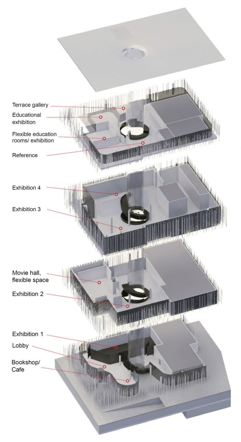 The operational part of the museum is a rational stack towards the north. This contains deliveries, storage, set upareas, back of house program and circulation. At the last level, the exhibition area merges with the educational area, creating a stage for experimentation and interaction.