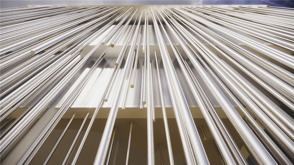 1. 垂直照明融入到柱群中,增强了屏幕的幻觉感,这是一个密集但可渗透的柱群。光线反射到闪亮的灯柱和镜面般的天花板,模糊了室内外的界限,将建筑隐藏在背后。柱状光是可编程的,可以改变强度和复杂程度。