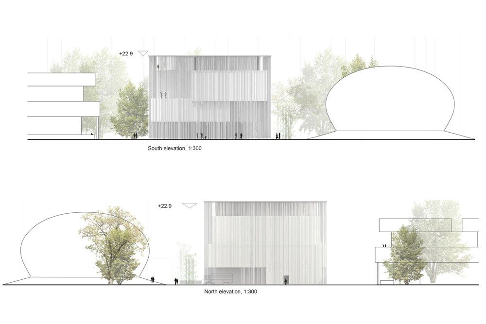 The building is a rational stack of volumes, containing the space for the various exhibition halls and the operational program. The stack is slightly shifted according to the program, creating exterior space with the opportunity of introducing controlled daylight into the exhibition areas at select points. The building is wrapped in prismatic glass, to enhance the blurring of the volume in interaction with the exterior forest of columns.