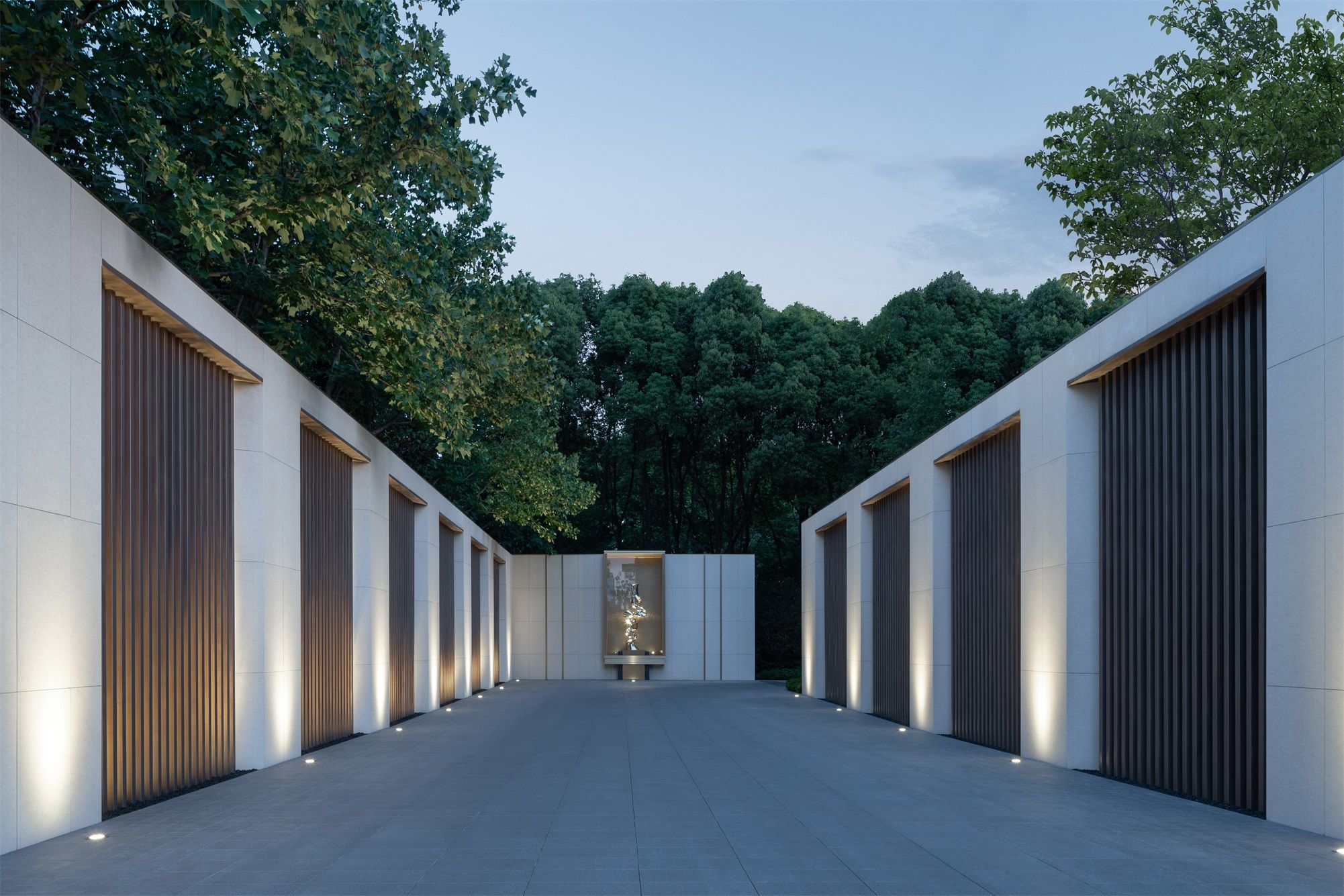 三进空间——江山·水府:清风摇曳,星辰大海如梦境般。建筑犹如宝盒坐落在一汪水镜纸上,水天一色,激起体验和情感上的觉醒。高奢酒店的品质感受,塔尖生活的极致体验。光与影的变化,几何形体的交错,给人以大气辉煌的感受。穿过辉煌的建筑,步入内庭,特色的植物如屏障般隔绝外界喧嚣,倒映在一汪水镜之上。高低错落的景墙,有序的排列在一起,与背景起伏的林冠线相呼应,形成强烈的韵律感。建筑坐落在水镜之上,与景墙围合出方正的空间格局,植物在水中倒映出笔直的树干,给人以大气舒朗的感受。