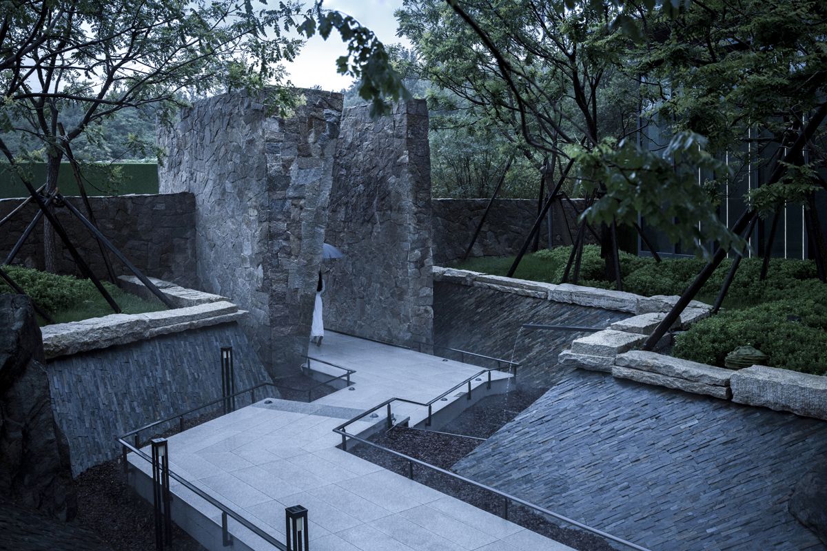 窄扉 高5米宽2.4米的山门,顶部向内倾斜,从整体的造型比例和材质本身粗犷的质感上给人以感官冲击。访客通过收窄山门,为进入内部空间做好情绪铺垫,以期达到山有小口彷佛若有光豁然开朗的空间感受。