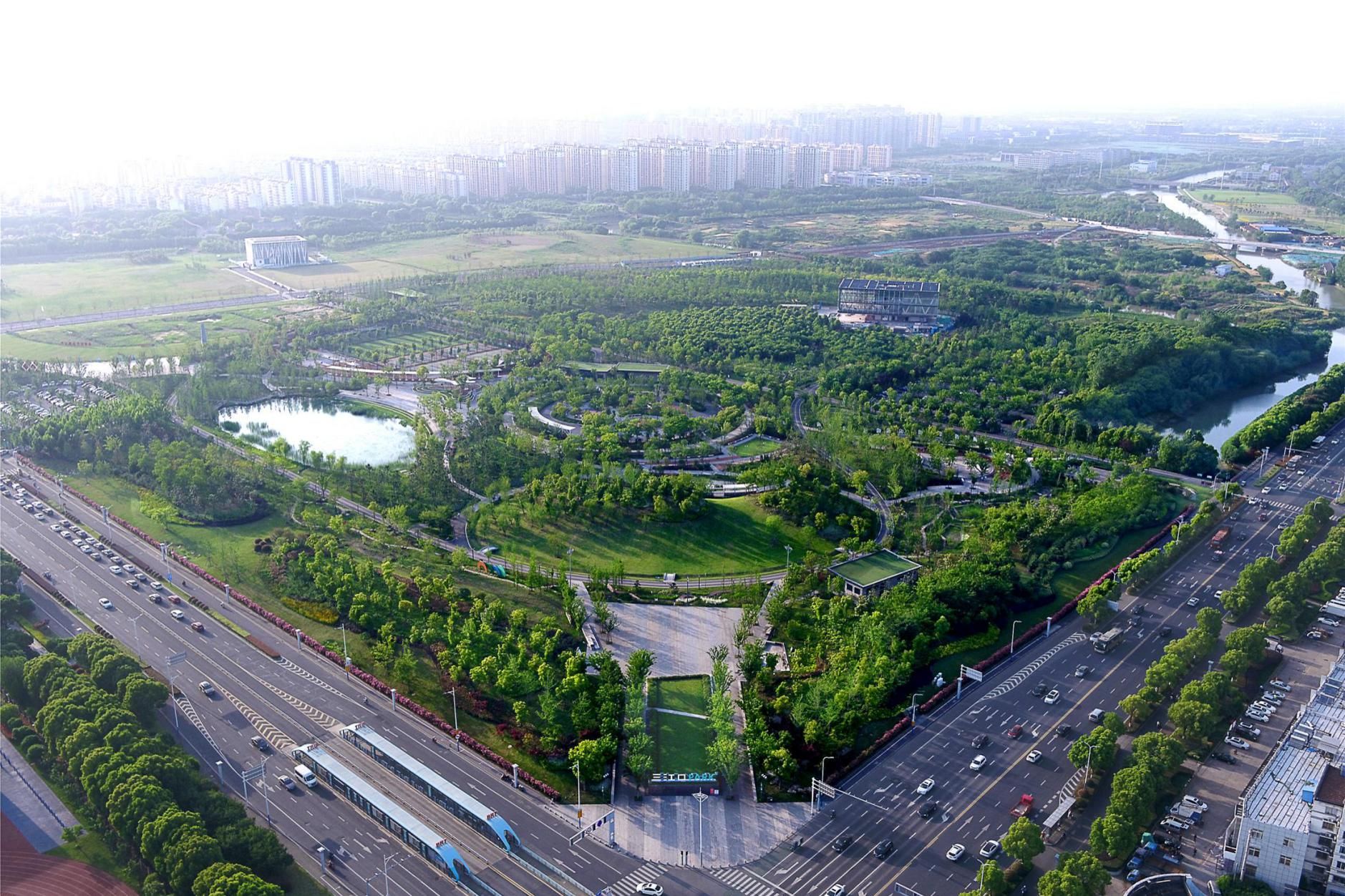 尊重现状,对场地内主路肌理、池塘及植被等进行保留。围绕其布局景观大台阶、栈桥、舞台、弧形廊架,多种特色空间,使此区域作为整个公园的核心景观亮点。