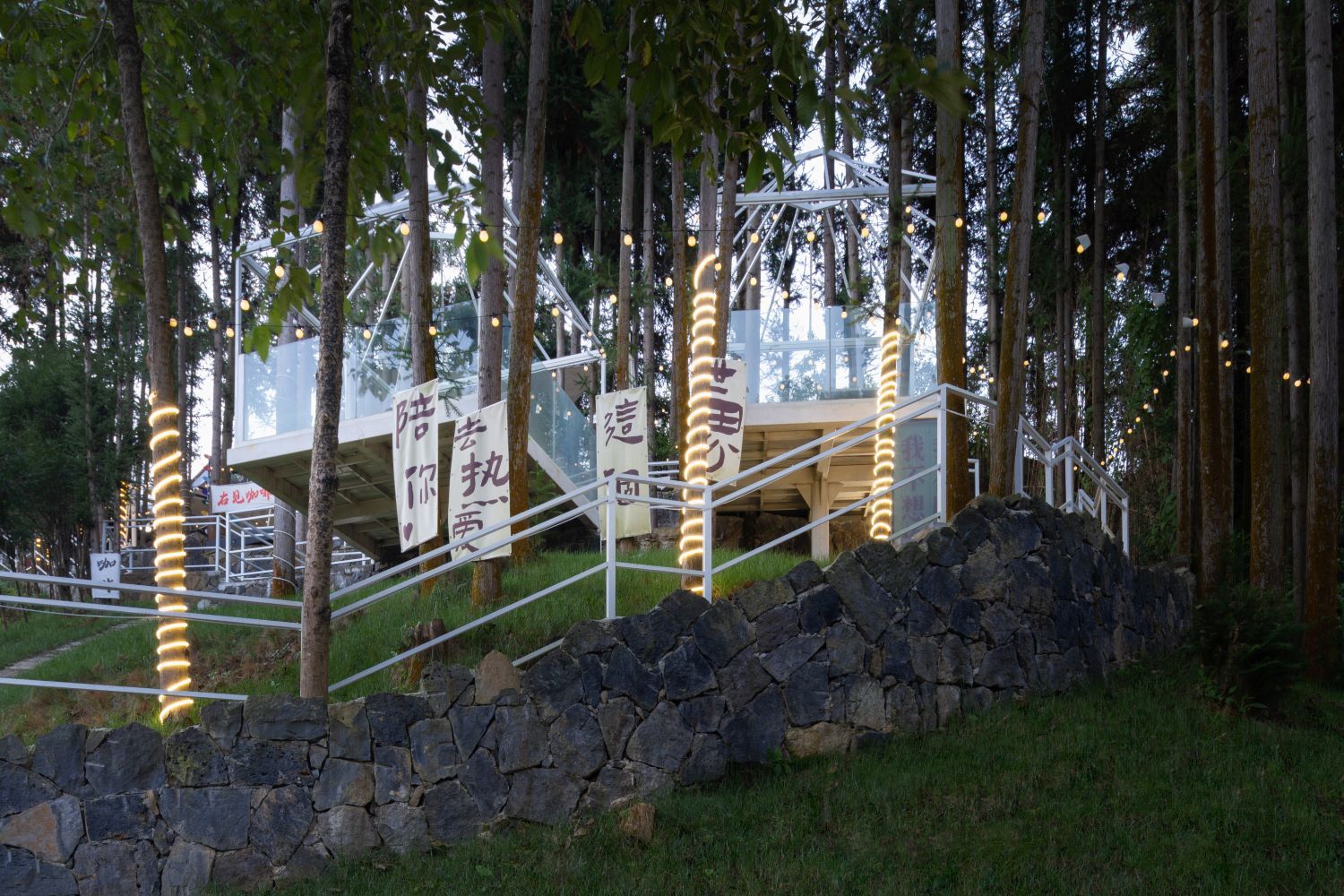 通过交错铺设的汀步走道,来到庭院处,这里特别设置了派对区,风雨幕布为空间增加了亮点,在夜晚的灯光映衬下显得富有造型感。通过交错铺设的梯步走道,来到林下剧场空间,林影婆娑,环绕声声笑语,同时月下浪漫派对给游客带来极致的身心放松体验。