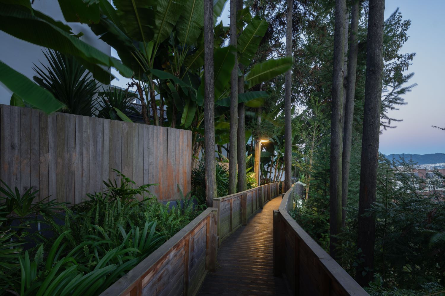 时间仿佛静止了,白色的构筑物游弋在云雾缭绕间,杉林让场景氛围更为突出,似远非远,面对略显局促的场地,设计对空间的开合收放关系做了全盘思考,用平台、折线栈道来体现收放节奏、丰富景观层次。