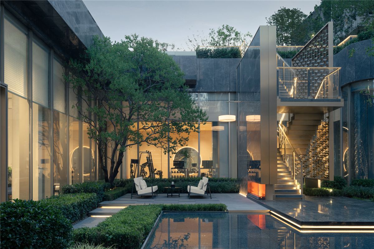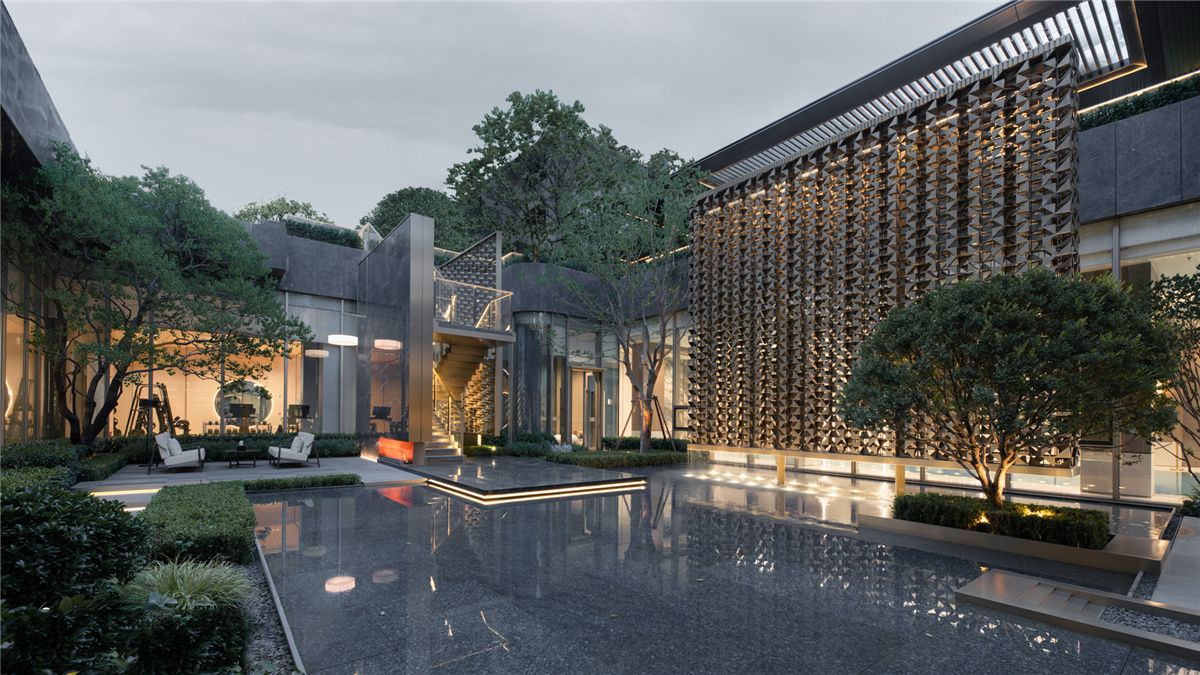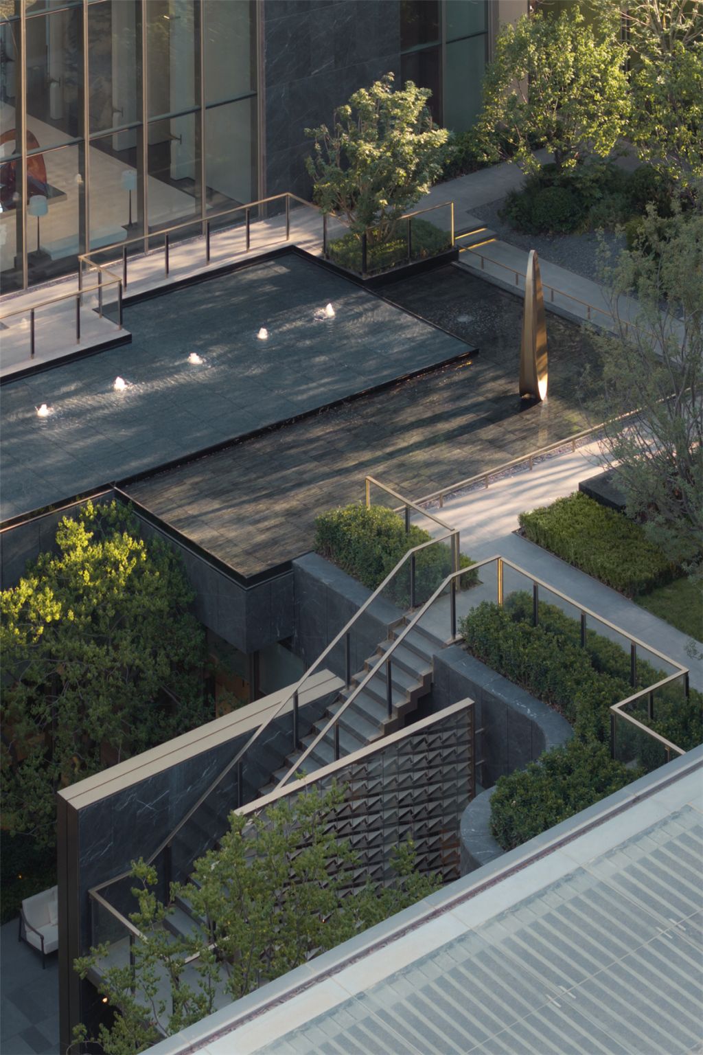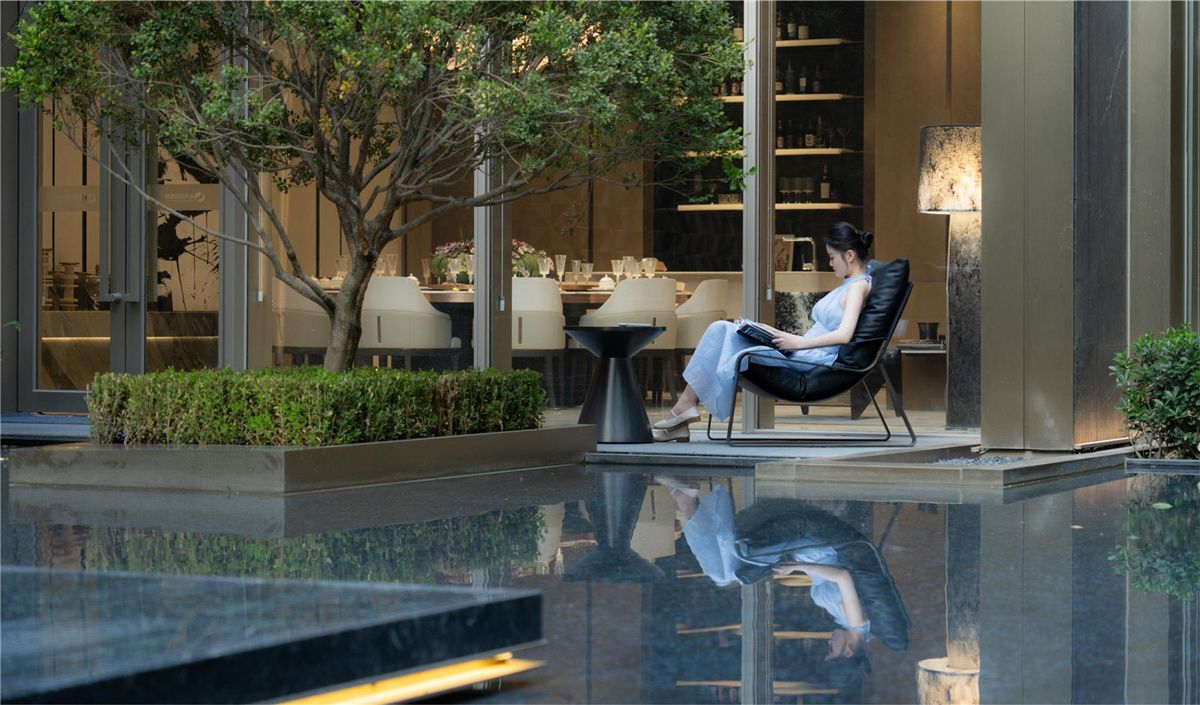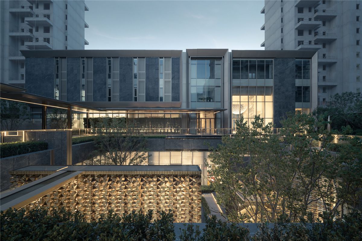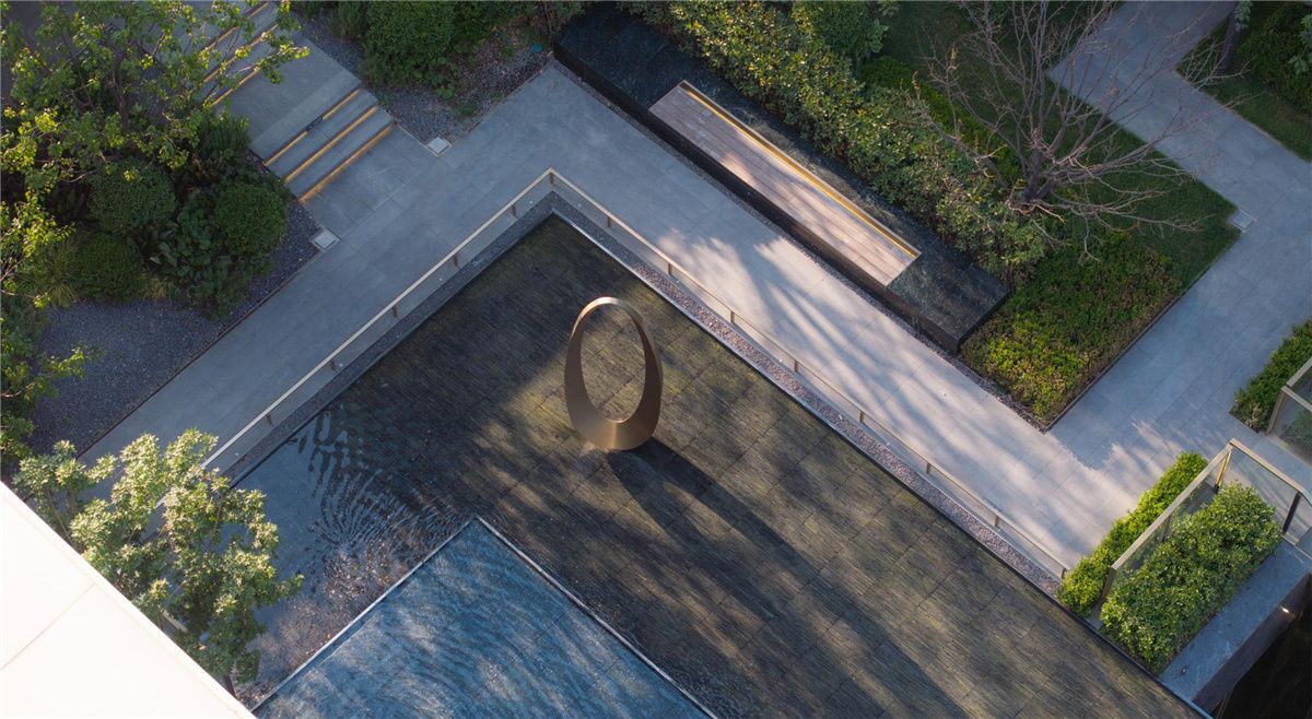 宁静阔达的镜水面呈现出引人注目,别具一格的设计力量。整体界面由雕塑、线条、材质肌理,展示出空间的情感,天光云影交叠出惬意的生活节奏。 The tranquil expanse of reflective water surfaces presents an eye-catching design force wi-th unique style. The overall interface displays emotional space through sculpture, lines, ma-terial textures-leisurely life rhythms interwoven with sky light and cloud shadows.