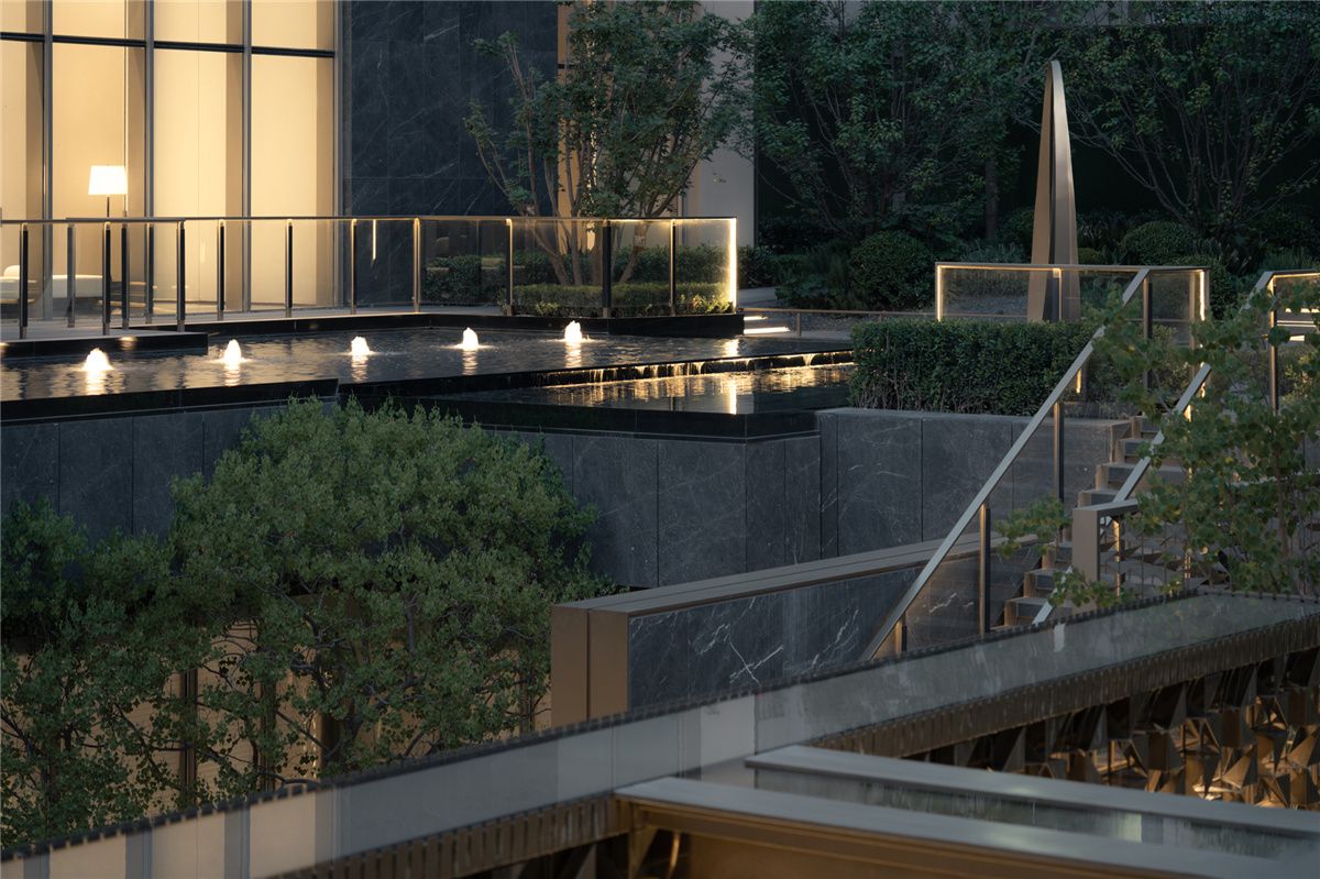 Clouds and Rainbows Waterscape, a luxurious custom showground that connects with theboundless courtyard below, creating an enchanting realm from form to scenery. At dawn,halos of light dance, and brilliant gold hues leap among droplets, presenting captivatingcolors that linger in memory.