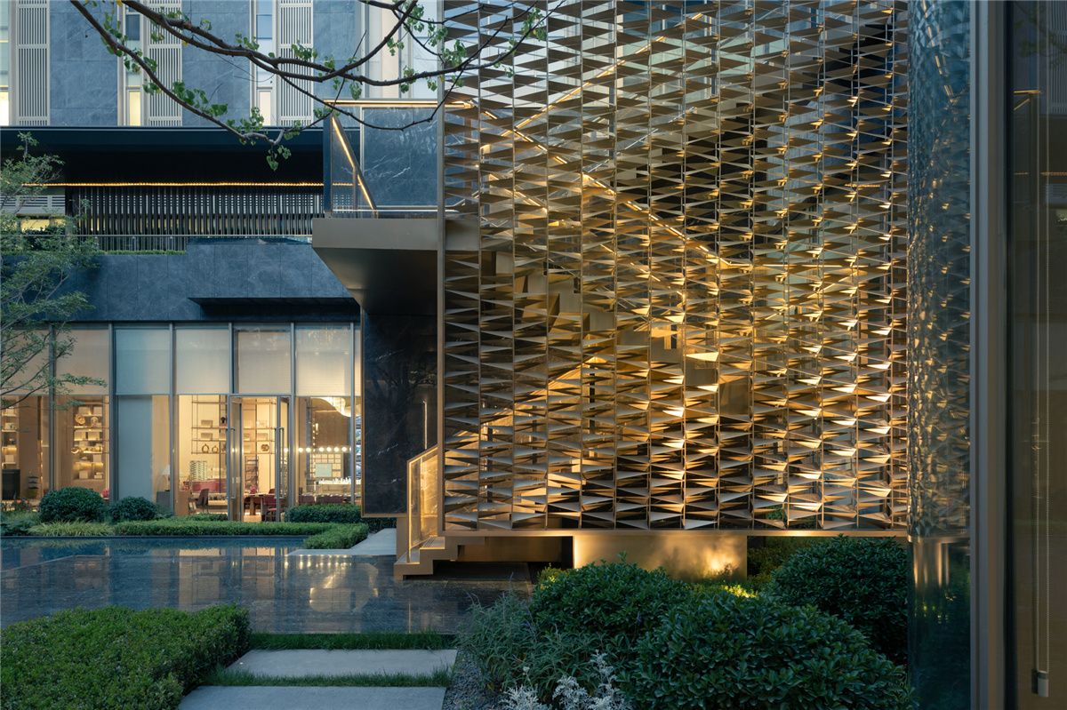 游廊转折处,高定的艺术屏风与廊架的巧妙衔接,精致栏杆与顶面线条设计的构造呼应,光影跳跃其中,在有限的空间里创造出多重的变化。 At the turning point of the corridor, high-end customized art screens cleverly connectwith corridor frames; exquisite railings echo with top surface line design construction,light and shadow dance within them, creating multiple changes in limited space.
