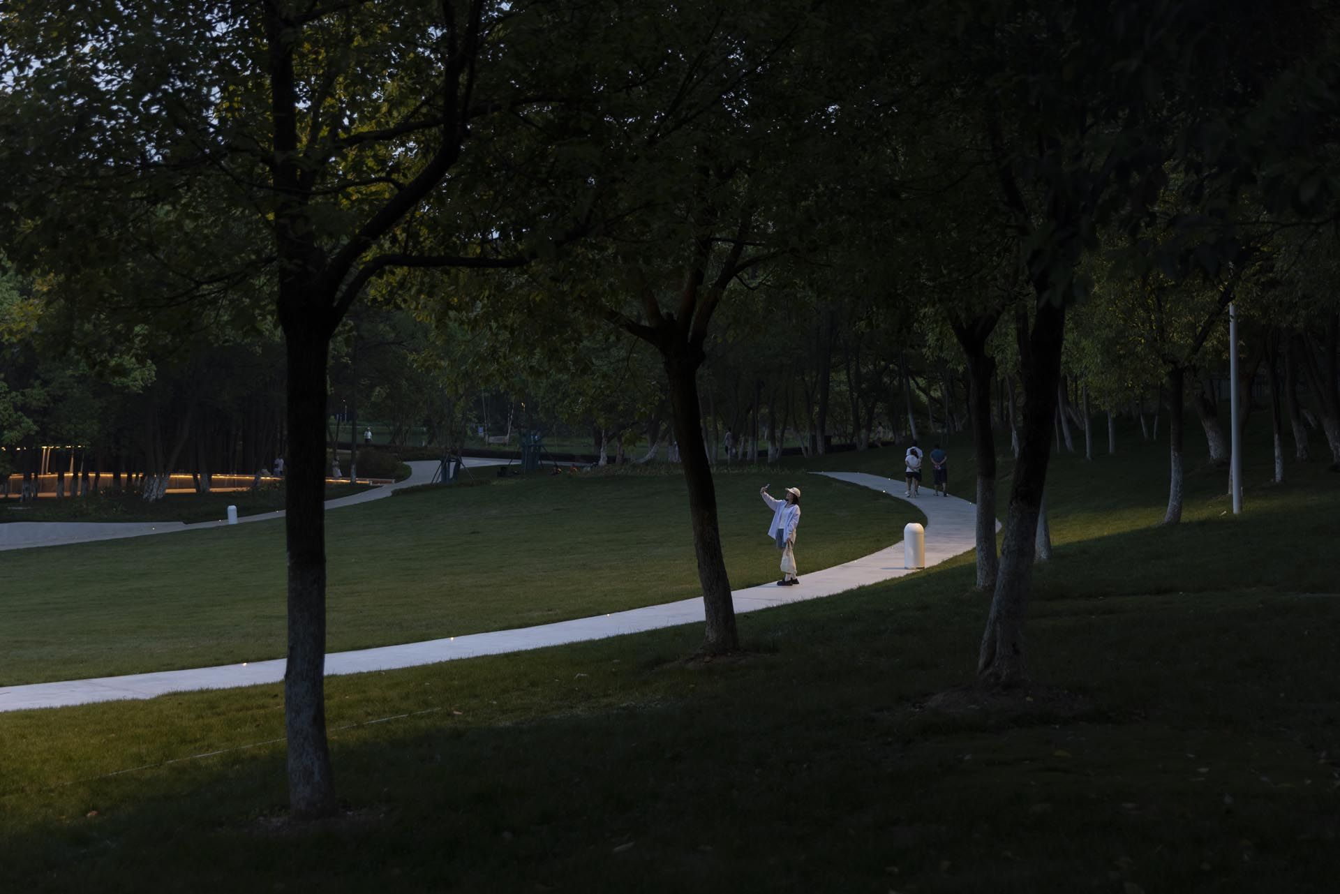 银白色的主色调和半透明金属网帘使舞台栈道与湖面、草坪、山丘、树木相互映衬,构成一个浑然天成的生态剧场。