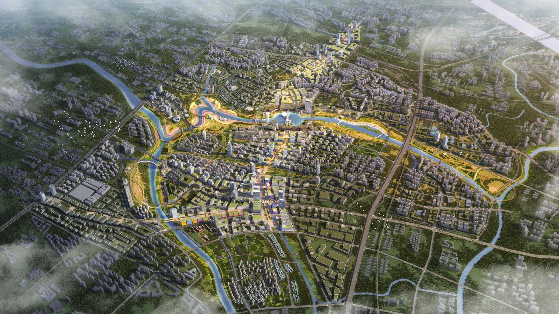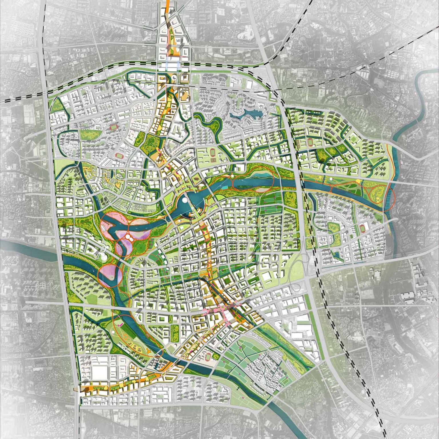 蓝脉绿脊,璀璨河岸:基于EOD 生态导向的设计理念,以水通脉,沿水引绿,打造蓝绿相融的生态之城。为广佛融城发展提供良好的生态基底,带动土地增值。连通基地内断头水系,使其形成一个洁净流动的活水系统。