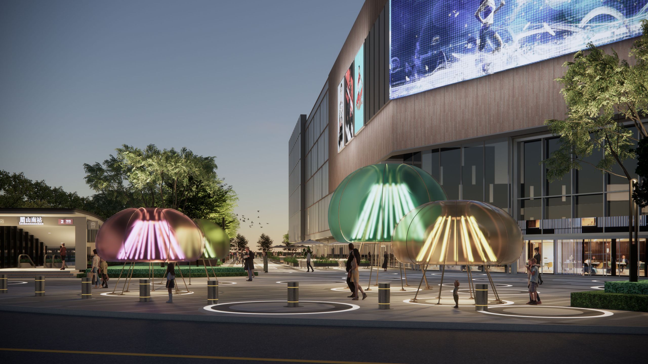 涌泉泡泡是商场前标志,更是夜间照亮场地的明灯。