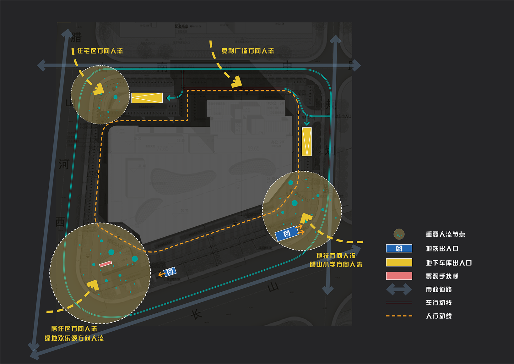 地块为西侧社区人群提供日常的生活服务,为北侧办公人群提供休闲空间。南侧地铁带来了远处的人群,地块东侧临近腊山小学,为学生放学后提供欢快的童梦空间。