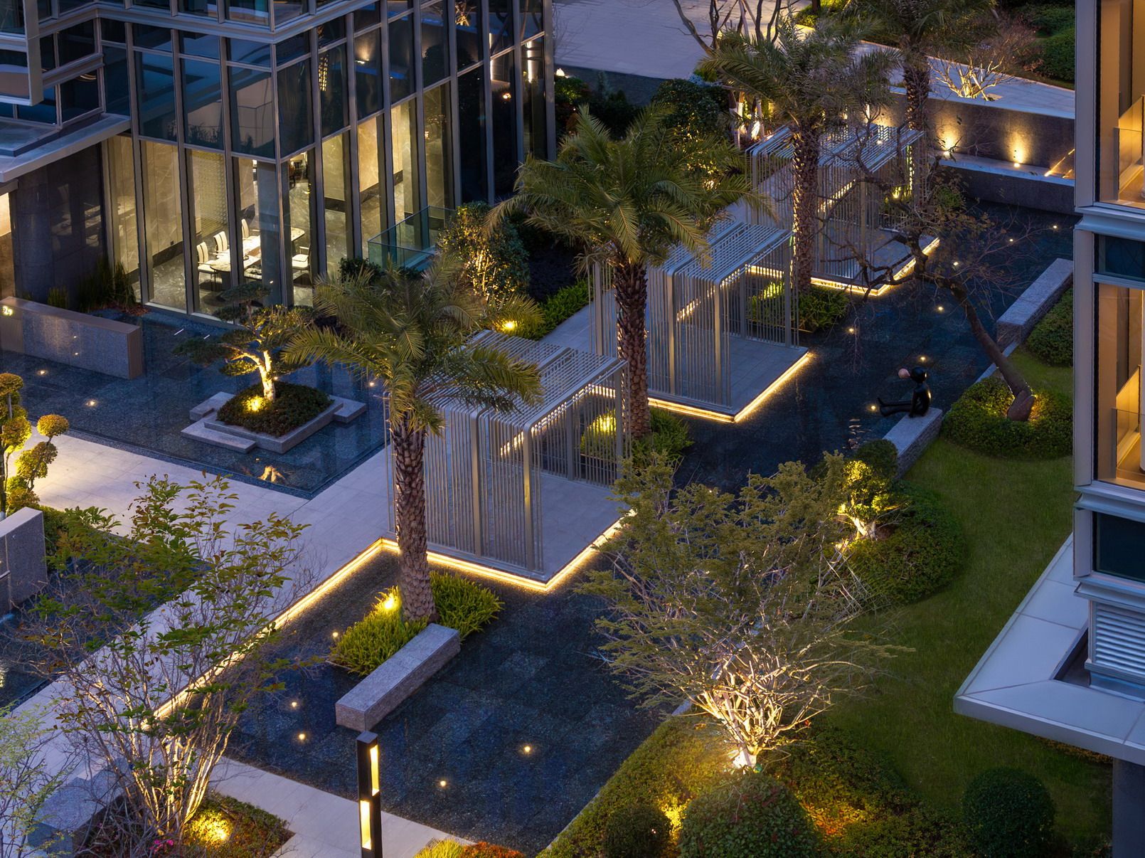 越过门廊,浸入森林。超长归家水轴,有序的秩序,通过阵列乔木,中心水景塑造出丰富的景观空间层次感,诠释居所的优雅格调。