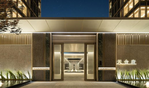 120米名片式超尺度尊享城市界面。主入口印入眼帘的是中心醒目的项目案名天合府logo,门庭磊落,大理石材质墙体点缀入口奢石结合竖向精工金属线条,刻画隐奢气质与尊贵仪式感。两侧迎客松如人伸出臂膀欢迎回家的业主,敞开式的空间布局在寸间中将繁华与静谧转换。