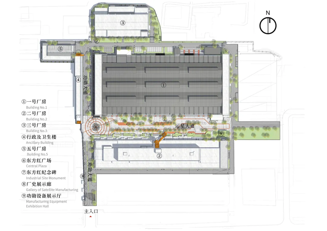 将原本“内向型”厂区改为“开放式”科技园是项目的重要策划定位。厂区由东西向(运星大道)与南北向(功勋大道)的两条主轴线构成,T字形交汇点是核心活动区域。在商业与配套价值最高的区域引入更多业态,创造区域内的活力热点。