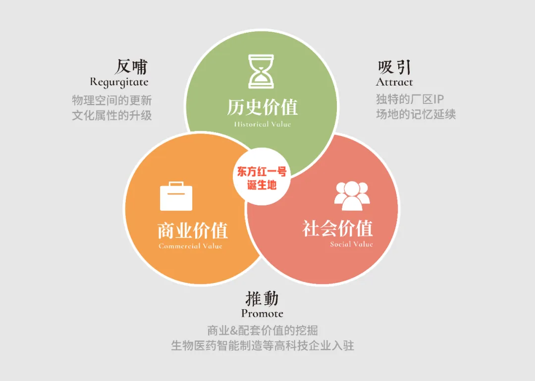 厂区独特的历史IP是驱动改造的内核,利用历史、社会、商业价值三者的联动形成效益闭环。以厂区的历史价值吸引大众走进不为人知的卫星制造厂,将场地内的商业价值最大化,为园区运营提供持久动力,进而反哺于物理空间与文化属性的升级。