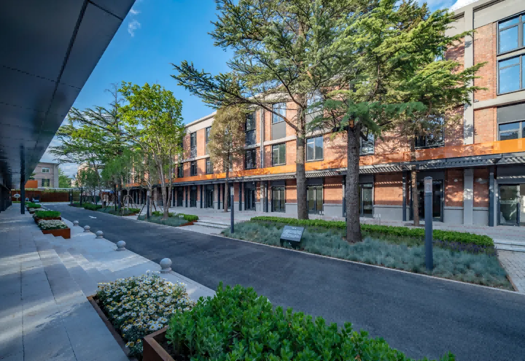 非工业遗址的2号及5号厂房采用更现代的改造手法,以米白色涂料打底,更换外窗,增加压顶、金属窗套等细节,在红砖建筑群中丰富空间形态。