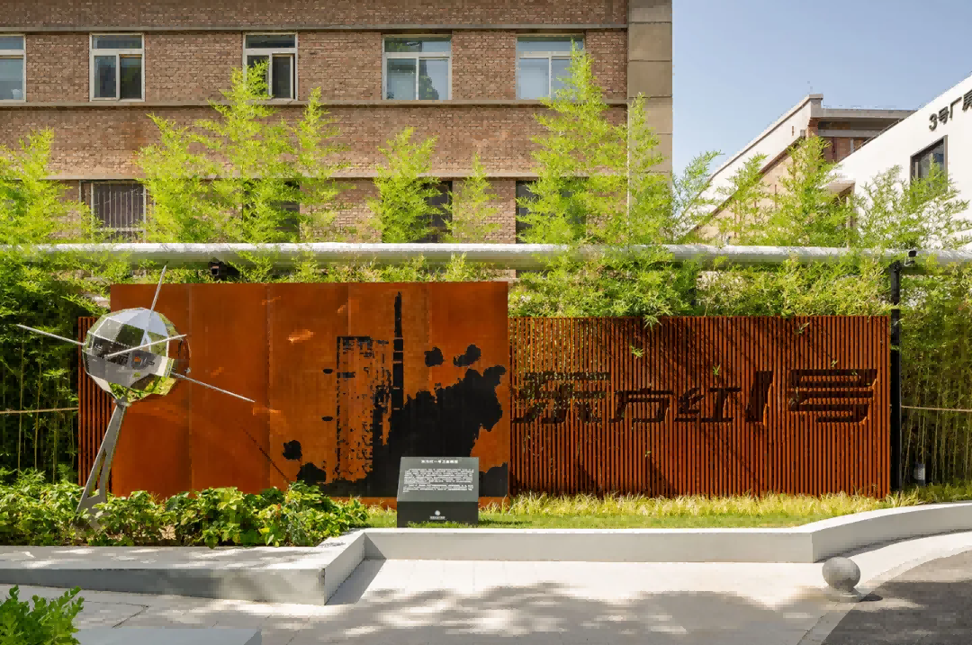 厂史展示廊的设计宛如一条时空隧道,让来客游走间了解厂区的历史。中心广场地面铺装嵌入金属材质的文字,记录我国发射的55组卫星名字和发射日期。南北轴线的终点是一比一复原的“东方红一号”卫星模型,以及“东方红一号”诞生地纪念碑。
