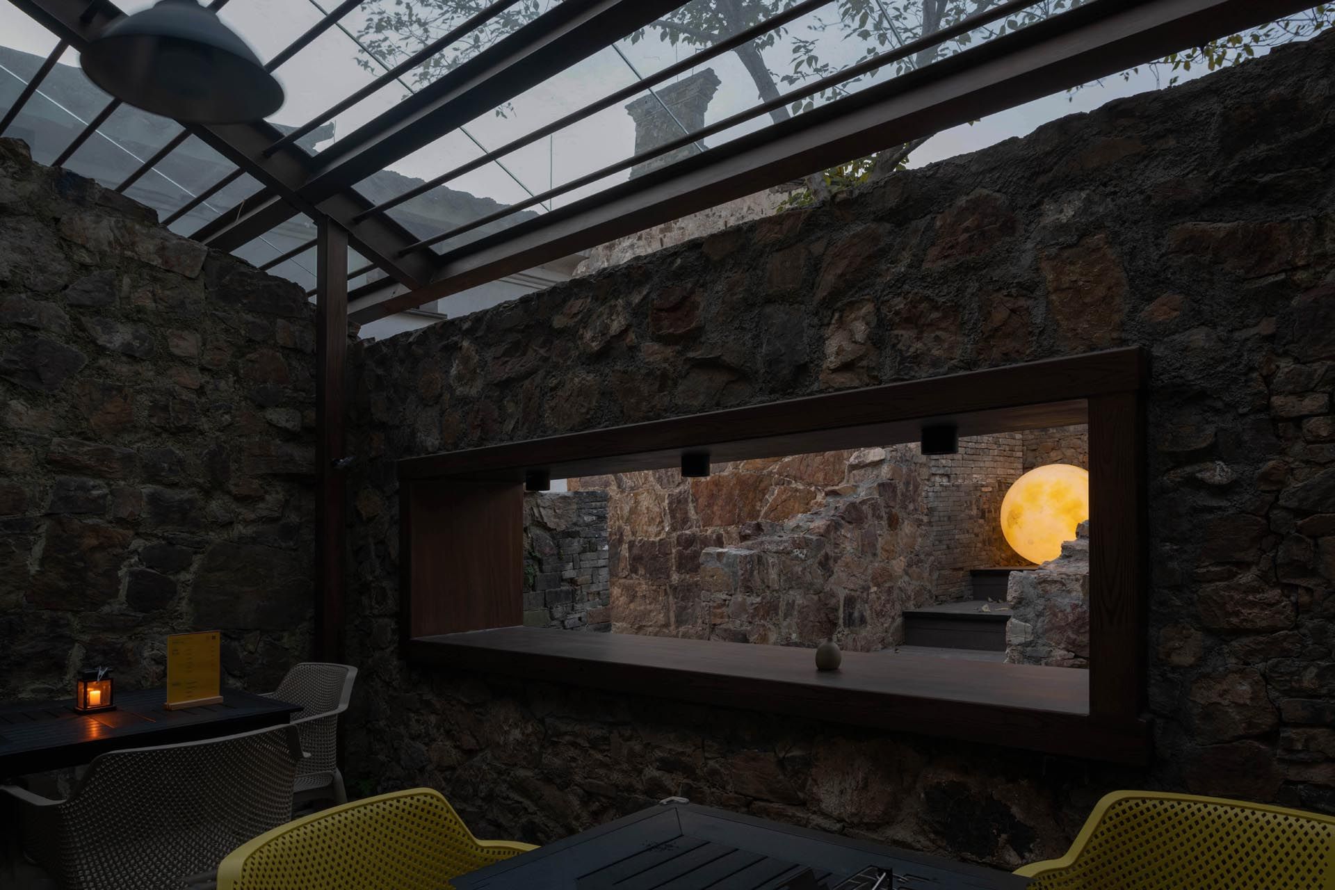 前院夜景 酒馆室内 室内空间完整保留了原始建筑的结构、门窗及铺地。 酒馆室内 室内座椅区 贯穿空间的门窗作为链接室内外空间的“纽带”,上午阳光可以从柱子与墙体中间的缝隙钻进来到室内区域,营造特别的阴翳美感。 酒馆二层 我们在保留后院遗存的黄石墙垣的基础上,增加了平台、阶梯、座椅等元素,以满足酒馆业态的使用需求。新业态的植入使这片废墟重获新生,让遗迹不再是仅供观看的展品。 后院空间 保留的老灶台 老灶台延续了过去的烟火气,如今虽野草丛生,但也别有意趣。 后院空间 后院空间 后院空间 后院空间 从窗洞向外看 从后门回看小院 砖墙细部 雪中的小院 轴测图 剖面图