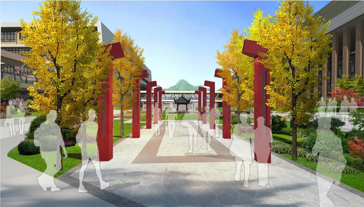 水景设计特色是采用雨水净化生态种植池,主要体现自然生态形象,通过填料的过滤与吸附作用,以及植物根系的吸收作用净化雨水,同时通过将雨水暂时储存后慢慢渗入周围土壤来消减地表洪峰流量。生态种植池一般下凹10-30cm,表面种植净化能力较强的植物,其填料自上而下通常依次为覆盖物、种植土壤、粗砂和砾石,底部一般设有排水系统。另外,该系统通常还包括进水和溢流系统等设施。好的景观立意给人以丰富的想象空间,内部布置水生植物,展现出一副天然的风景画。水池中间加入“观鱼”“赏莲”等要素,加强人的亲水性、趣味性和观赏性,使游人更容易与自然融合。 树阵广场 入口效果 广场设计方案巧妙融合了自然与人文元素,展现出独特的视觉艺术魅力。入口小广场作为视觉焦点,以开阔的空间迎接村镇居民,彰显了大气与包容。红色路灯设计成门型,不仅具有导向作用,还寓意着喜庆与热情,为空间增添了温暖氛围。两侧草坪上银杏树成排,既美化了环境,又通过四季变换的色彩,丰富了广场的层次感与韵律感。“广场迎客展新姿,门型路灯映红曦。银杏成排添绿意,美景如画醉心脾。”这首诗词描述了此地空间的设计理念和意境之美,