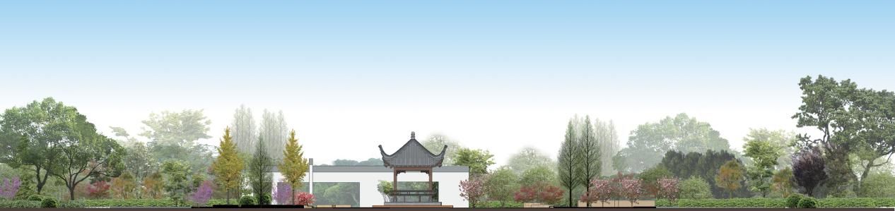 文化景墙 在现代景观中,景观墙主要用于分隔空间,丰富景致层次及控制、引导游览路线作用,又可将小空间串通迂回,呈现小中见大,层次深邃的意境。方案当中的景观墙为白色粉刷墙体,顶部为石材压顶,两组墙体呈高度错落交叉布局,建筑风格现代简约,和谐统一,体现江南地区“粉墙”意境和回归生活的自然情怀。由于墙体所在的位置为西入口和水景之间,为避免产生空间压抑感和游人的视觉疲劳,在墙体立面设计五个通透的门洞,形成的框景与绿化结合,营造破墙透绿的效果。