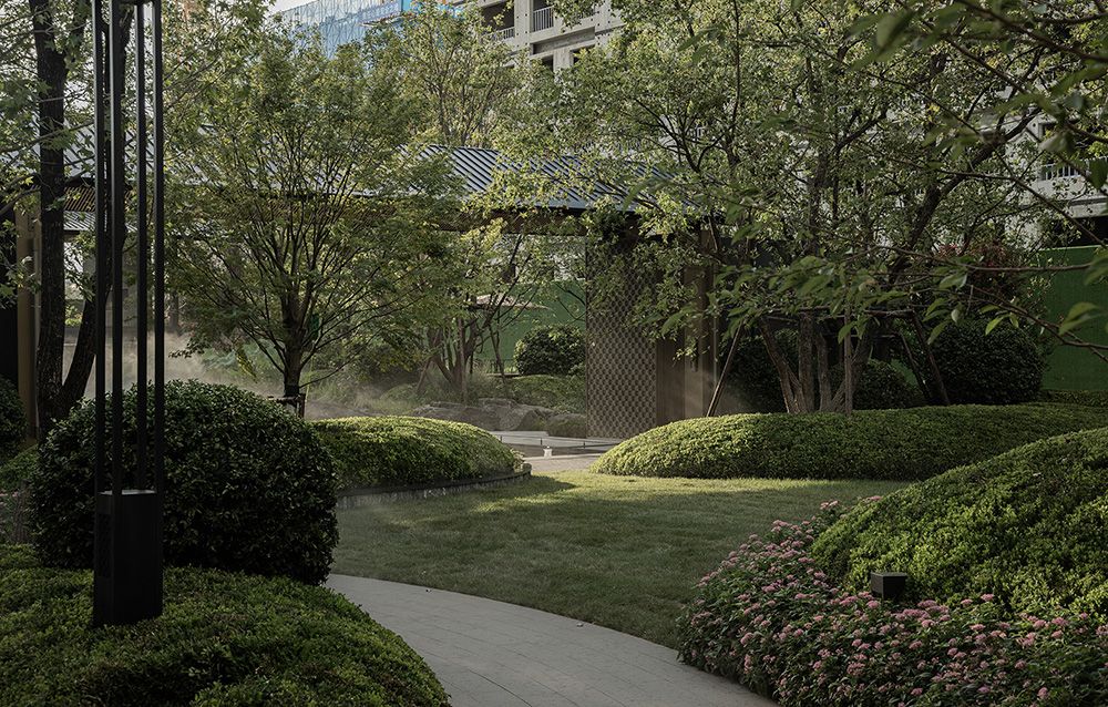 【御道 |碣石晨雾】 释放雅奢质感,构建礼序归家之路,铺陈“御苑”卷轴 “初极狭,才通人。复行数十步,豁然开朗。” 通过两侧弧形景墙,游园情绪得到进一步压缩聚拢,继而视线舒张打开,豁然开朗。步入拾光御道,弧形小径做基底,矮墙与植物掩映,仿佛是来自山林之中的一抹景致,让人们在繁忙的都市生活中找到心灵的栖息地和诗意的居住体验。