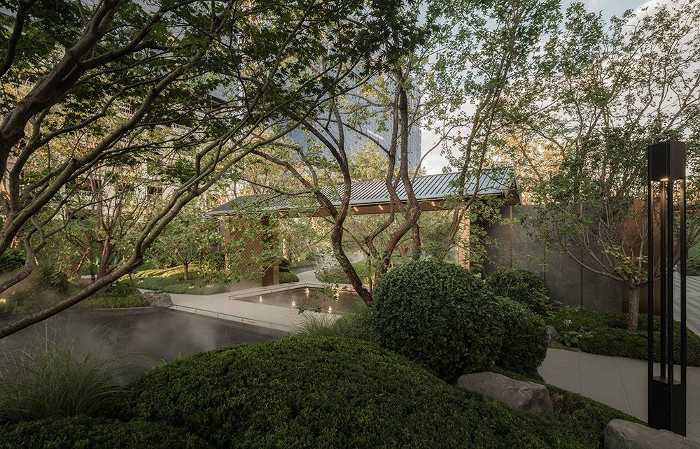 【藏山 |林隐涧韵】 依托传统文化底蕴,叙述东方美学人居 入口大堂方向与归家轴线形成35°夹角,且紧贴消防通道,如何打造进入大堂后第一视线落点并实现轴线的转折? 空间的转换是情绪的铺陈,景观将视觉与消防功能井然有序的巧妙结合。消防通道采用弧形跳色铺装形式,利用地面铺装的微妙变化,实现游园动线的暗示与引导。叠水、置石、种植结合作为入园第一视线落点,通过弧形景墙加强场地的礼序感,压缩聚拢游园视线,将动线引入核心轴线,弱化轴线的转折。 ·高山流水——将山脉连绵的形态特征融入对景空间,叠山理水,营造雅致闲适、伴水而行的东方人居体验。 ·鎏金照壁——借皇家苑囿建筑中“照壁”空间布局,彰显奢华归家礼序