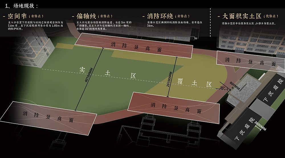 【场地 · 感知】 首开区位于场地前半部分宅间及主入口区域,分析现状场地特征 优势点: -大面积实土区:实体示范区范围内中后段大部分区域为实土区,仅小部分为覆土区。 劣势点: -空间窄:主入口位置下沉庭院与红线之间景观空间仅有2.6m宽,且下沉庭院四周最小需有1.05m高的防护栏杆。 -偏轴线:主入口大堂后场紧贴消防通道,且入口大门与宅间不在同一轴线,存在近35°的视线角度差。 -消防环绕:实体示范区两侧环绕消防登高场地,最窄处仅26m。
