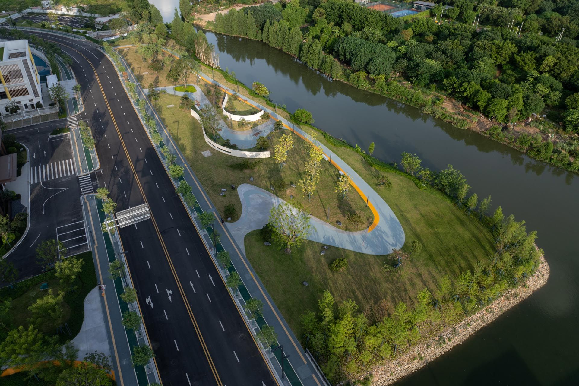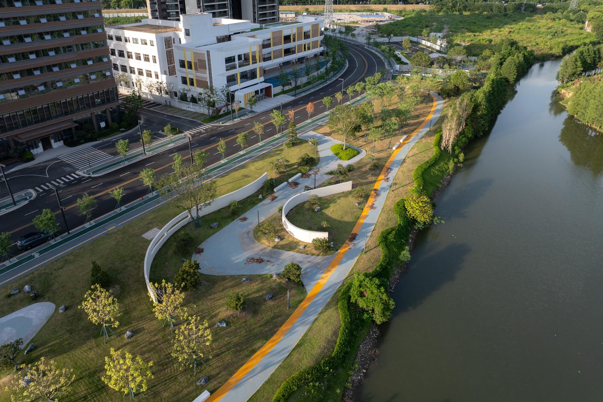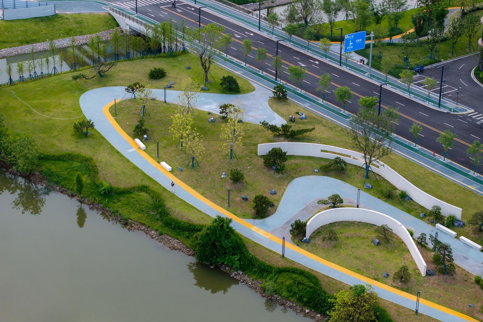 场地内有一条长达2000米的跑道蜿蜒其中,为市民提供了一个安全的跑步、散步、休憩的场所,对鼓励人们进行户外锻炼、促进身体健康有重要作用。跑道均匀地环绕在各个区域,环绕河道设计,让使用者在运动的同时享受周围的自然美景,增强了游玩的体验感。