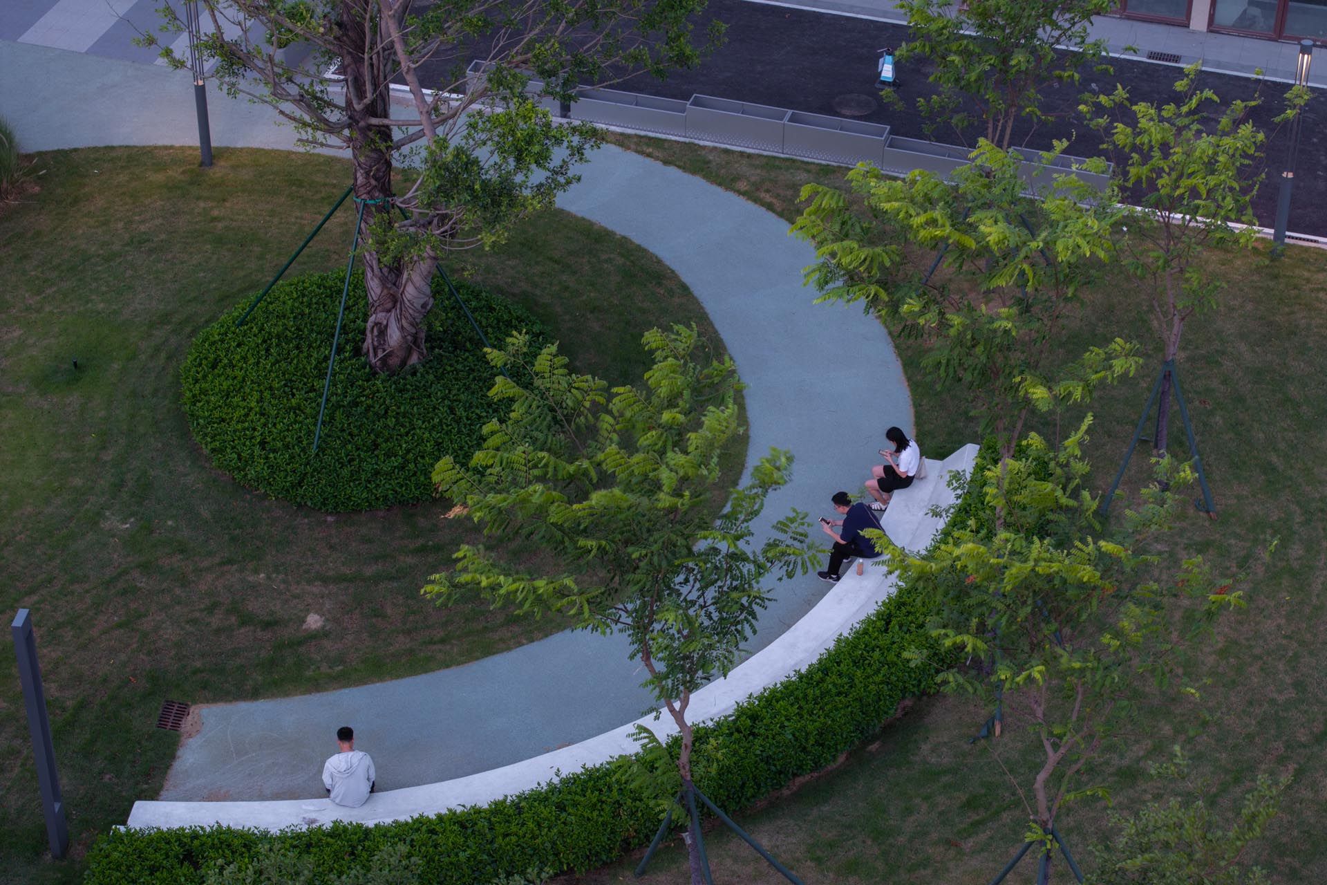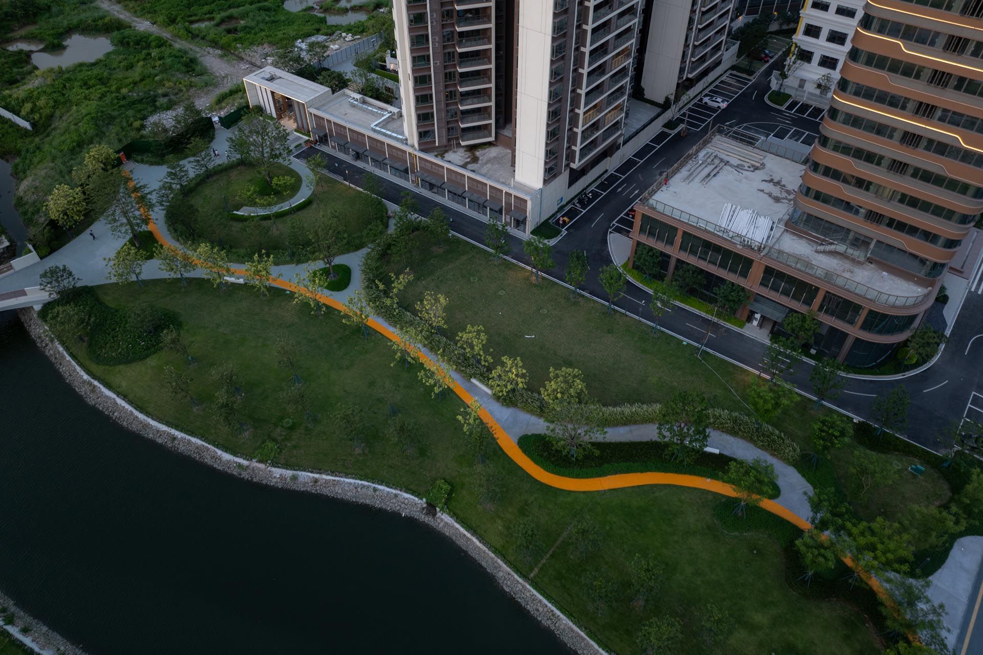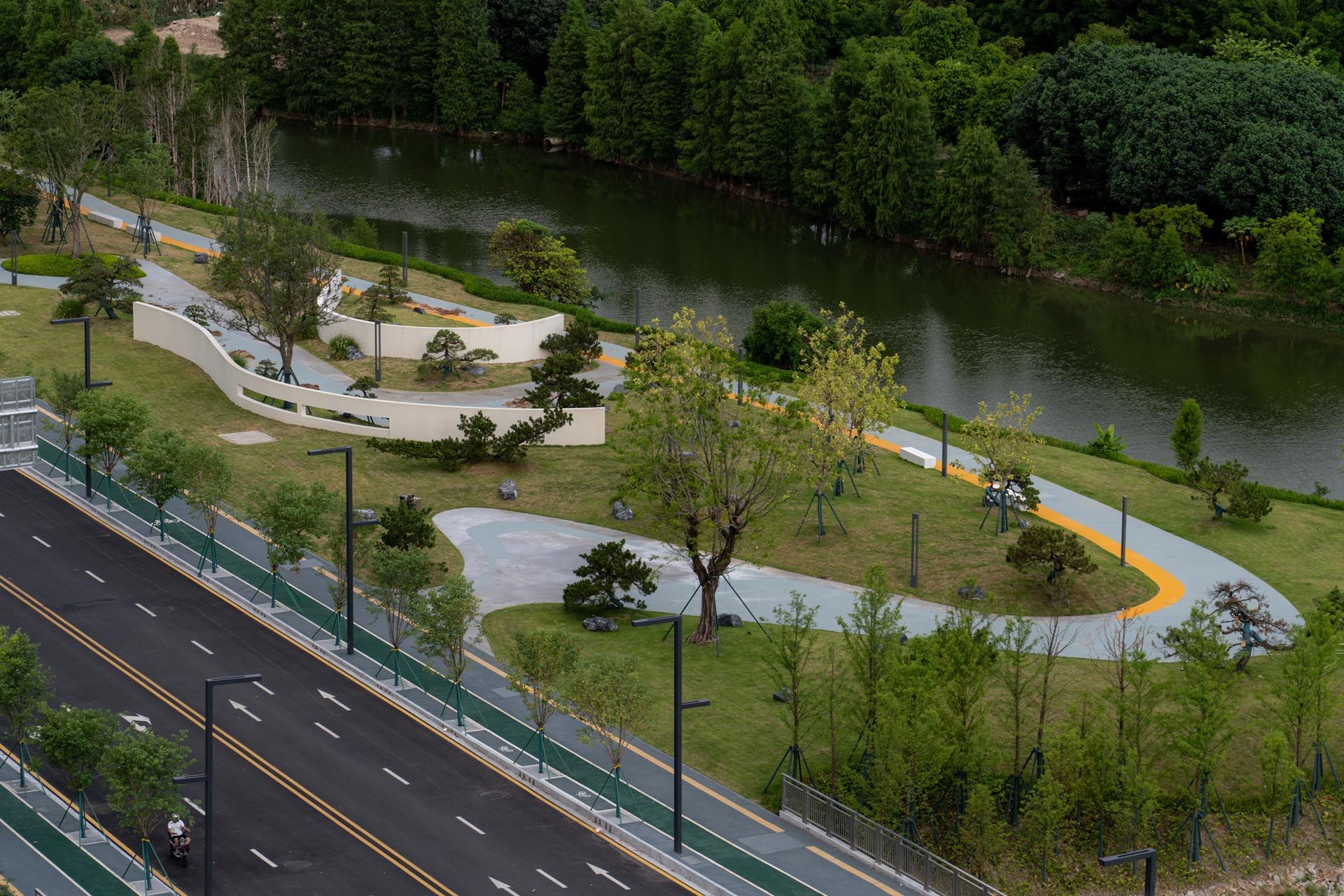 场地内有一条长达2000米的跑道蜿蜒其中,为市民提供了一个安全的跑步、散步、休憩的场所,对鼓励人们进行户外锻炼、促进身体健康有重要作用。跑道均匀地环绕在各个区域,环绕河道设计,让使用者在运动的同时享受周围的自然美景,增强了游玩的体验感。