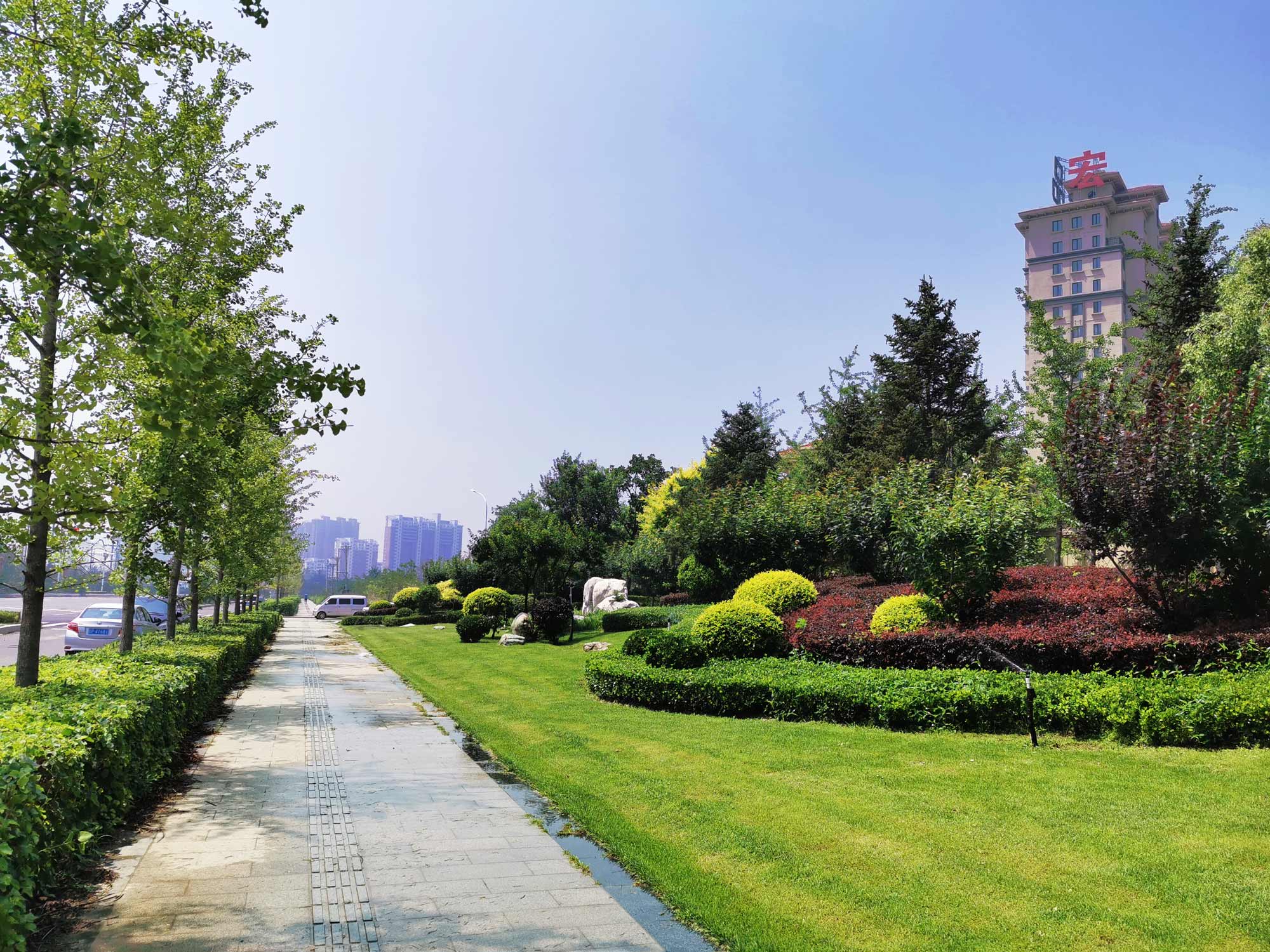 龙兴路位于辽宁省兴城市,是连接兴城与葫芦岛市的一条主干道。兴城依山傍水,东南沿海为平原,中部多为丘陵,西北部为山区,空气湿润。草坪长势较好。两侧绿化带有些草坪景观。