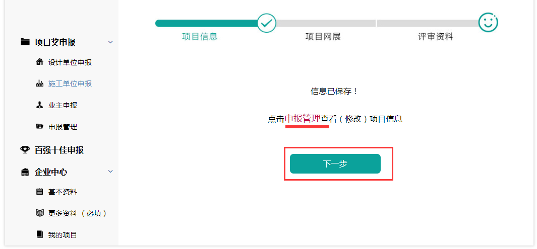 填写完项目信息,然后点击【保存】,保存后显示基本信息填写完成,可下一步上传项目网展图。(也可填写【申报管理】,这里可以看到已经申报了的项目)