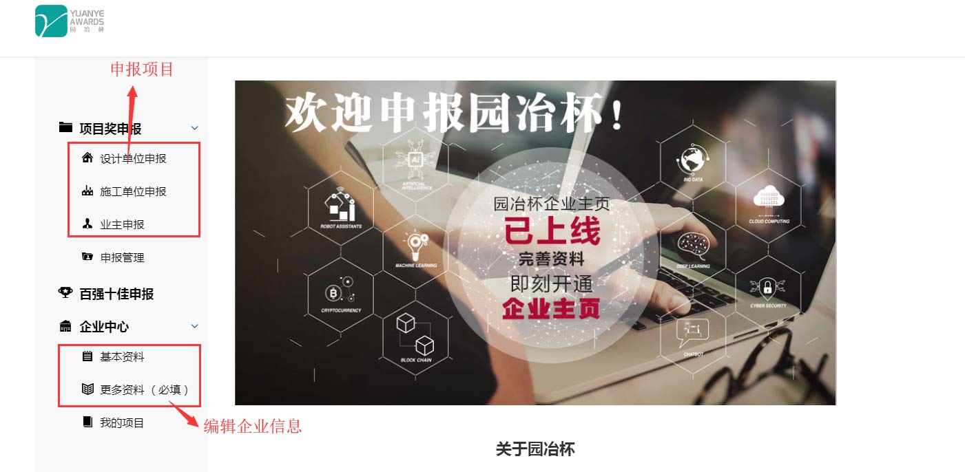 进入报奖后台,可以看到页面左侧的导航,分别可以查看企业信息,申报项目列表,以及申报项目。